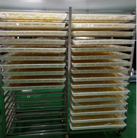 把浸泡好的檸檬片擺上托盤,注意擺放均勻,不能堆疊,放入推車,推進(jìn)烘干房?jī)?nèi)。