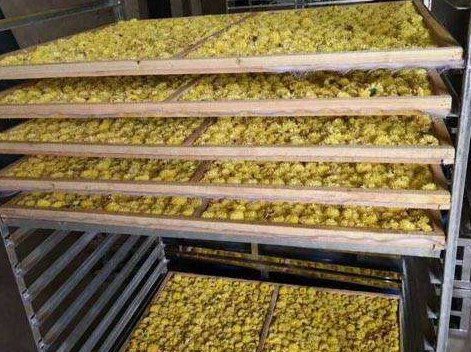 一、擺盤:將采摘好的鮮花倒入托盤,鮮花不能重疊太厚。擺好的鮮花盤可以直接放入烘車上,一次多擺幾盤,全部擺放完畢后可將烘車推入烘房進行烘干。胎菊的烘干除了菊花本身采摘時的濕度還有