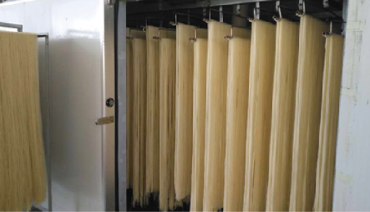 米粉的干燥工藝主要分自然晾曬干燥和烘烤干燥。老化后的米粉凝固較緊,因此在干燥前需用清水清洗,梳理整齊后放入烘烤架上烘烤。烘烤干燥要有專業(yè)的烘烤線,整個(gè)烘烤過程都在室內(nèi)進(jìn)行,并通過傳送帶流動(dòng)烘干,烘烤間主要?jiǎng)澐殖扇齻€(gè)溫區(qū):低溫區(qū)、高溫區(qū)和冷卻區(qū)間。