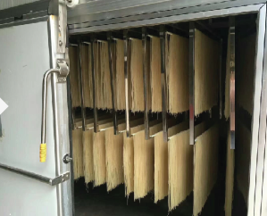 米粉如果放置形式為掛起來的,對風(fēng)路有影響,需要加裝軌道電機(jī)來使風(fēng)量和熱量更均均。否則,容易出現(xiàn)風(fēng)路前面的過干,而風(fēng)路尾端又還沒有干的情況。烘干過程中,宜以低溫大風(fēng)量為合適。過高的溫度,極容易出現(xiàn)斷粉。風(fēng)量不夠,傳熱不均,也是另外一個(gè)很重要的問題。另外,烘干后不要馬上拉出來,烘干房內(nèi)外溫差過大,極容易造成米粉卷曲變形,造成外觀缺陷。